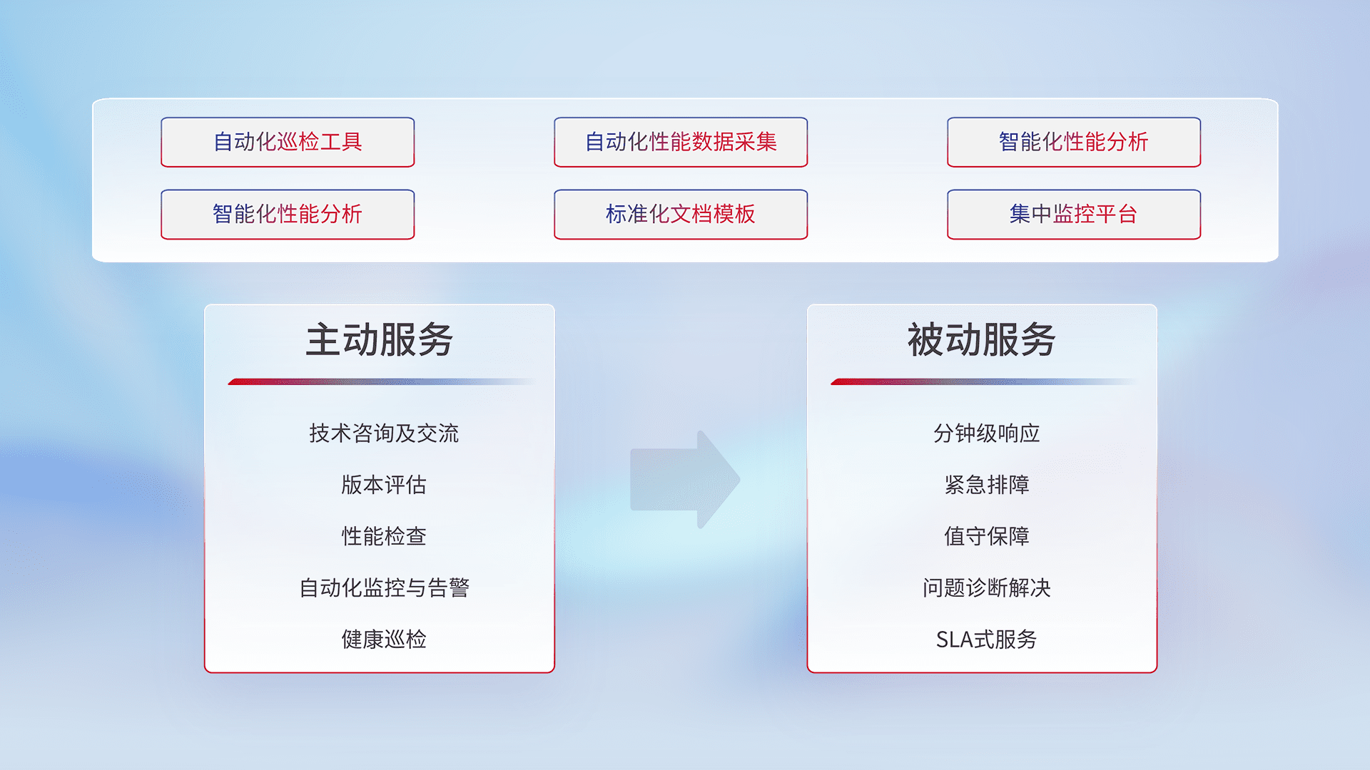 智能化工具和标准化文档,,保障服务质量,,,提供主动服务(包含技术咨询、、、版本评估、、性能检查、、、、自动化监控与告警、、、、健康巡检)和被动服务包含(分钟级响应、、、、紧急排障、、、值守保障、、、问题诊断解决、、SLA服务)。。